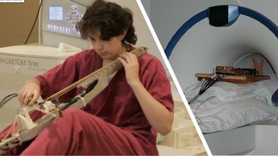 The optically sensed fMRI-compatible electro-acoustic cello, the first ever developed, enables neuroscientists studying motor learning in musical tasks to perform functional brain scans while capturing detailed information on the cellist’s instrumental gestures, such as fingering, bow speed, and bow pressure.