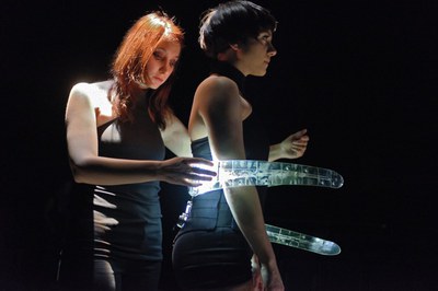 Two dancers manipulating motion-sensitive digital instruments during a performance of Les Gestes