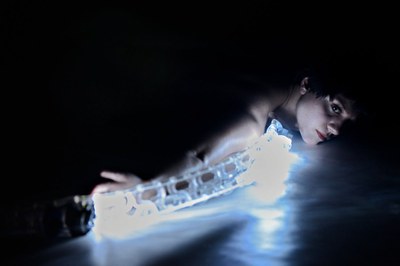 Dancers and musicians create an intimate fusion of sound, movement, and technology throughout the performance. On a four-sided stage illuminated by geometric projections, luminous sculptural instruments respond to the performers’ gestures, producing ethereal harmonies intertwined with live violin and cello music. A dancer explores these futuristic instruments through tactile, animal-like movements, forging a primal connection between body and sound. As the performance unfolds, the boundaries between dancer and musician dissolve—gestures and music become one. The result is a poetic, sensory experience where technology enables “music that can be seen and dance that can be heard,” transcending traditional choreography to inhabit the space between movement and sound.